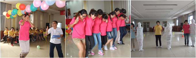 待裁判員宣讀完比賽規(guī)則后,大家都躍躍欲試,蓄勢待發(fā),活躍的氣氛到處可見。第一個項目是“輕松扎氣球”,要求各個方隊1名隊員參與比賽,身高限于1.6米以下的女生,參賽隊員將別有細(xì)針的發(fā)卡戴在頭上,聽到比賽口令后,用發(fā)卡頂球的方式將垂掛在天花板下方的氣球頂破,在規(guī)定的時間內(nèi),扎破氣球最多的獲勝。開始時,參賽隊員沒有充分掌握比賽技巧,發(fā)夾的細(xì)針沒有對準(zhǔn)氣球,跳了幾次不得要領(lǐng),周圍助威的同事,有不斷出點(diǎn)子的,有吶喊助威的,有總結(jié)別人經(jīng)驗(yàn)的,有加緊練習(xí)的,還有捧腹大笑的,場面很是熱鬧。參賽隊員經(jīng)過調(diào)整,順利、公平地比完了第一個項目。