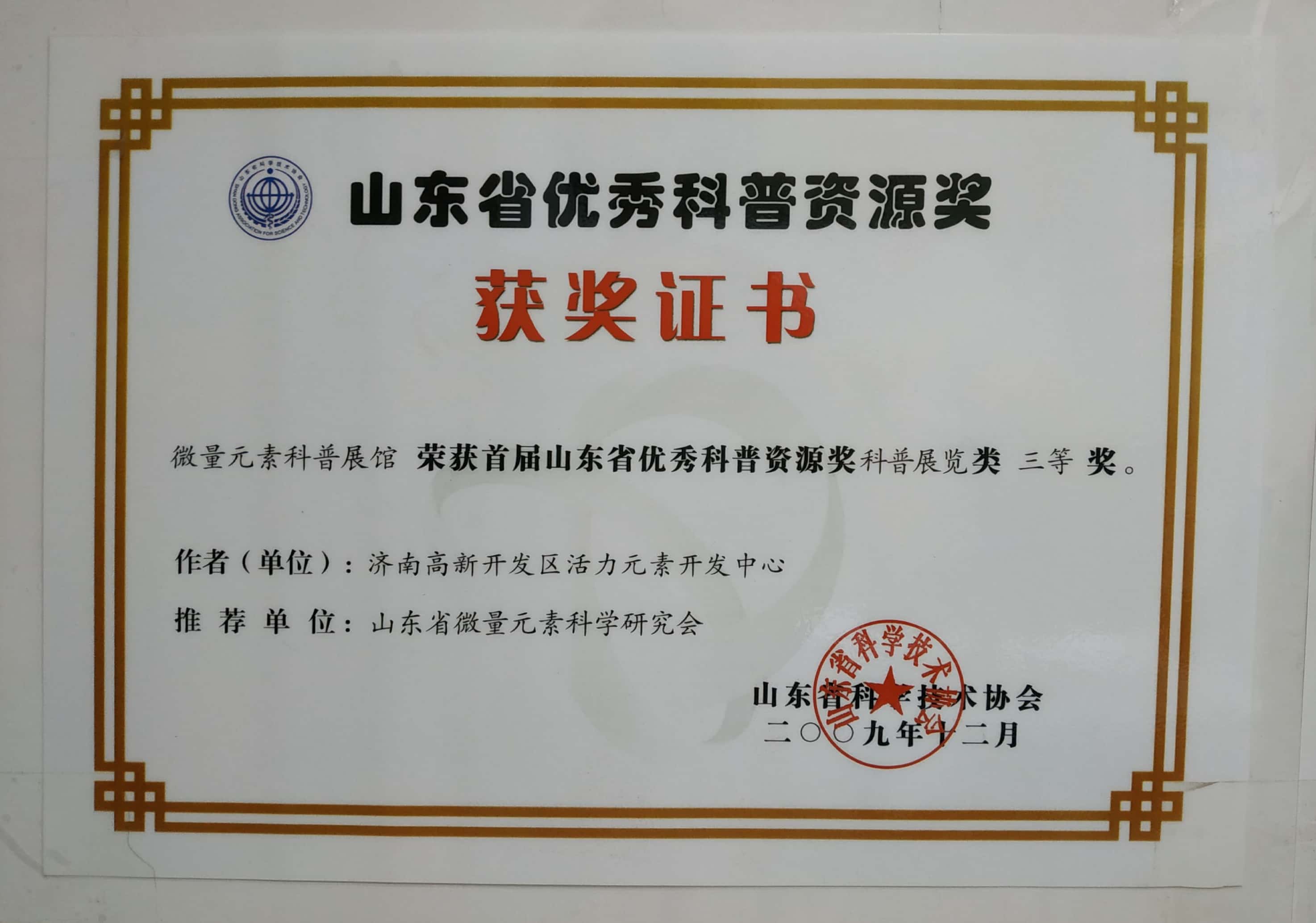 2009年被山東省科學(xué)技術(shù)協(xié)會(huì)評(píng)為“山東省優(yōu)秀科普資源獎(jiǎng)”