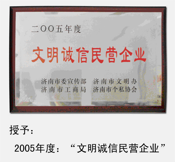 2005~2010年,被濟(jì)南市委宣傳部、濟(jì)南市文明辦、濟(jì)南市工商局、濟(jì)南市個(gè)私協(xié)會(huì)評(píng)為“文明誠信民營企業(yè)”
