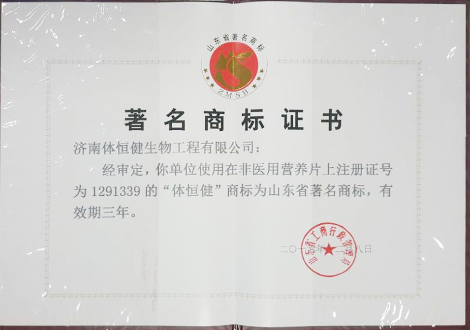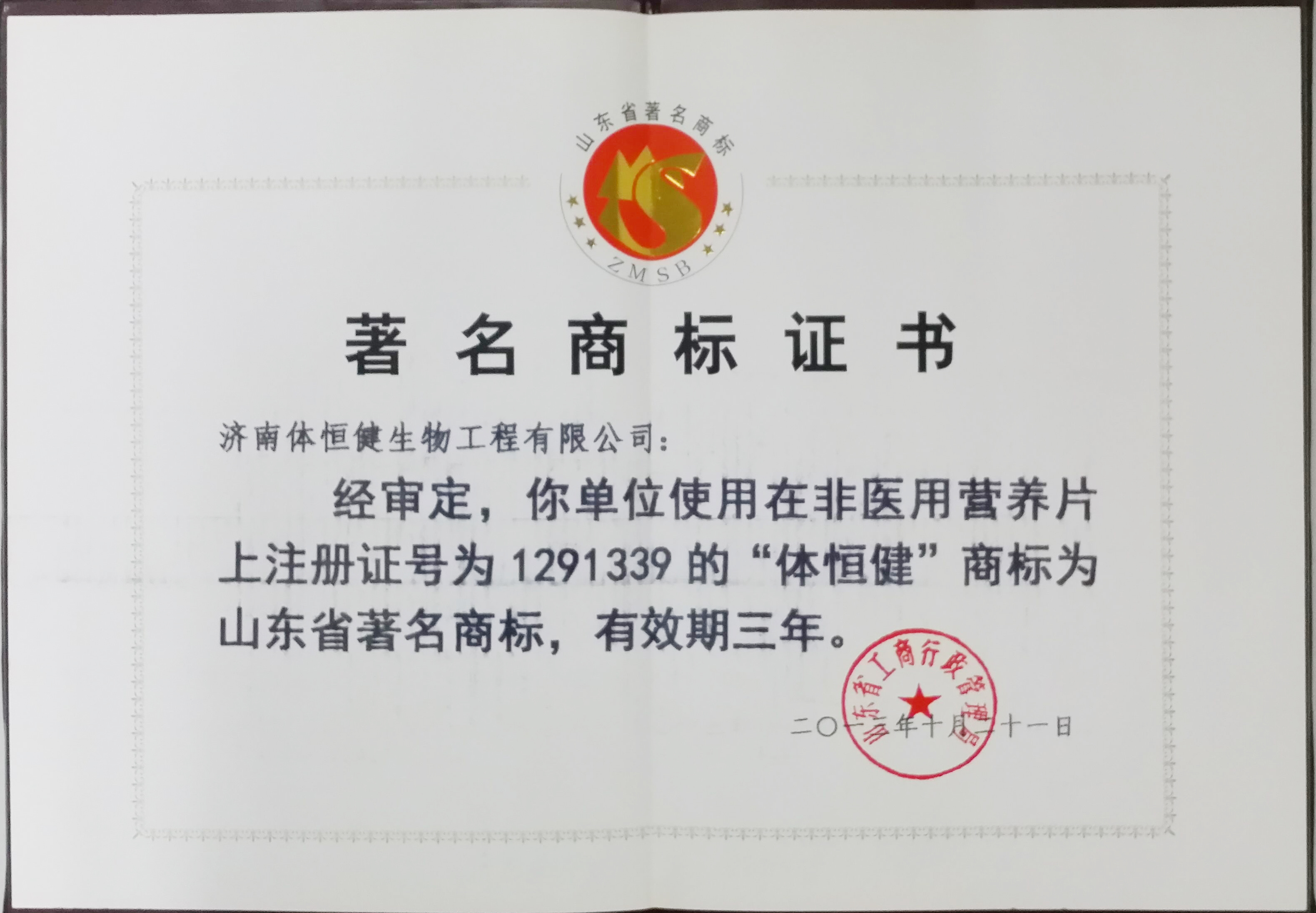 2010年,“體恒健”被 山東省工商行政管理局評(píng)為“山東省著名商標(biāo)”