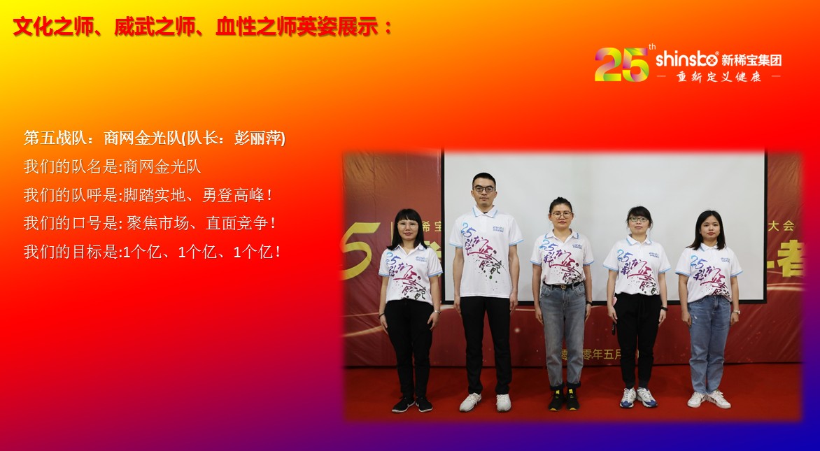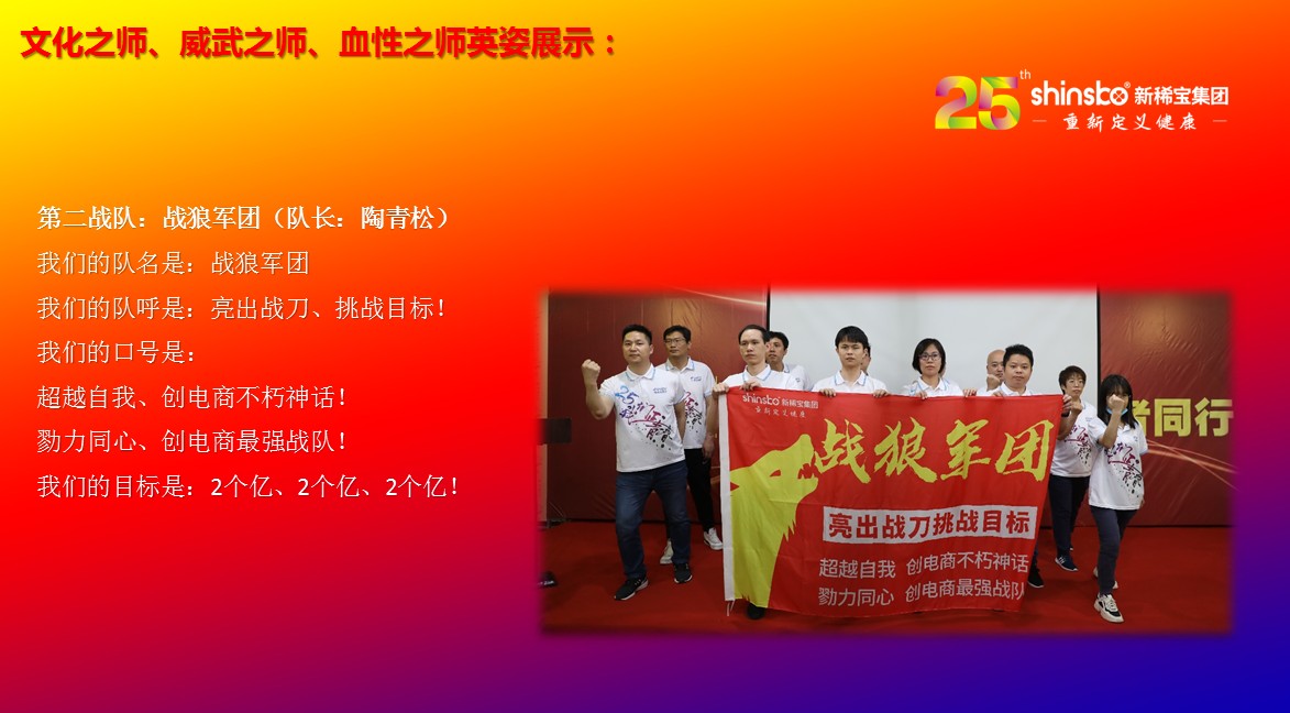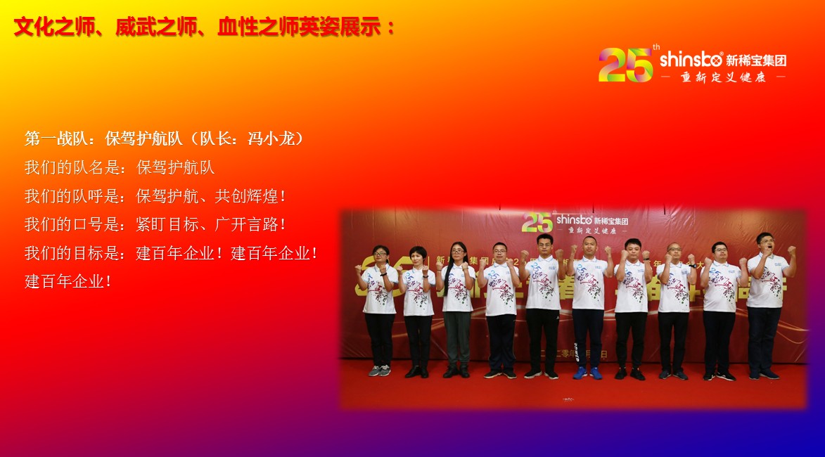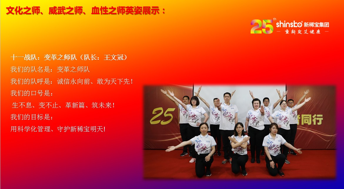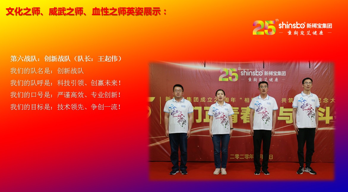 在文化儀式后緊接著舉行了隆重的“文化之師、威武之師、血性之師” 誓師大會(huì)。各戰(zhàn)隊(duì)步入會(huì)場(chǎng)就被熱烈的現(xiàn)場(chǎng)氛圍所感染,主屏展架抒寫“25我們正青春”與奮斗者同行的格言,大紅背景墻點(diǎn)綴出新稀寶集團(tuán)“相聚攜手 共筑百年”25周年紀(jì)念大會(huì)”活動(dòng)主題,兩條大氣宏偉、耀眼奪目橫幅 “增強(qiáng)緊迫感、聚焦主戰(zhàn)場(chǎng)、打好翻身仗;抓住新機(jī)遇、創(chuàng)造新優(yōu)勢(shì)、再創(chuàng)新輝煌”為誓師大會(huì)營(yíng)造了良好戰(zhàn)斗氛圍,使各戰(zhàn)隊(duì)、各戰(zhàn)將從視覺上、思想上、感知上,感受到公司的凝聚力、向心力、變革力、戰(zhàn)斗力。