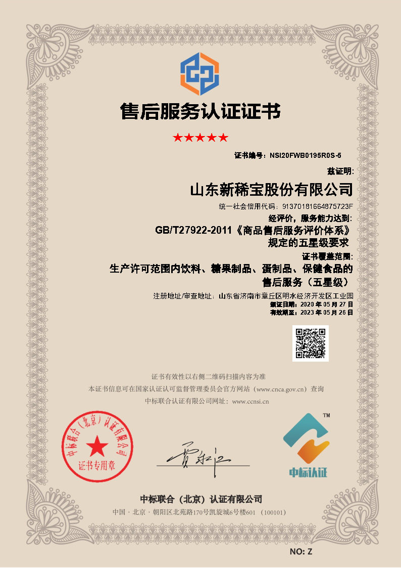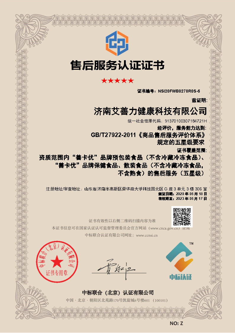 五星級售后服務認證證書