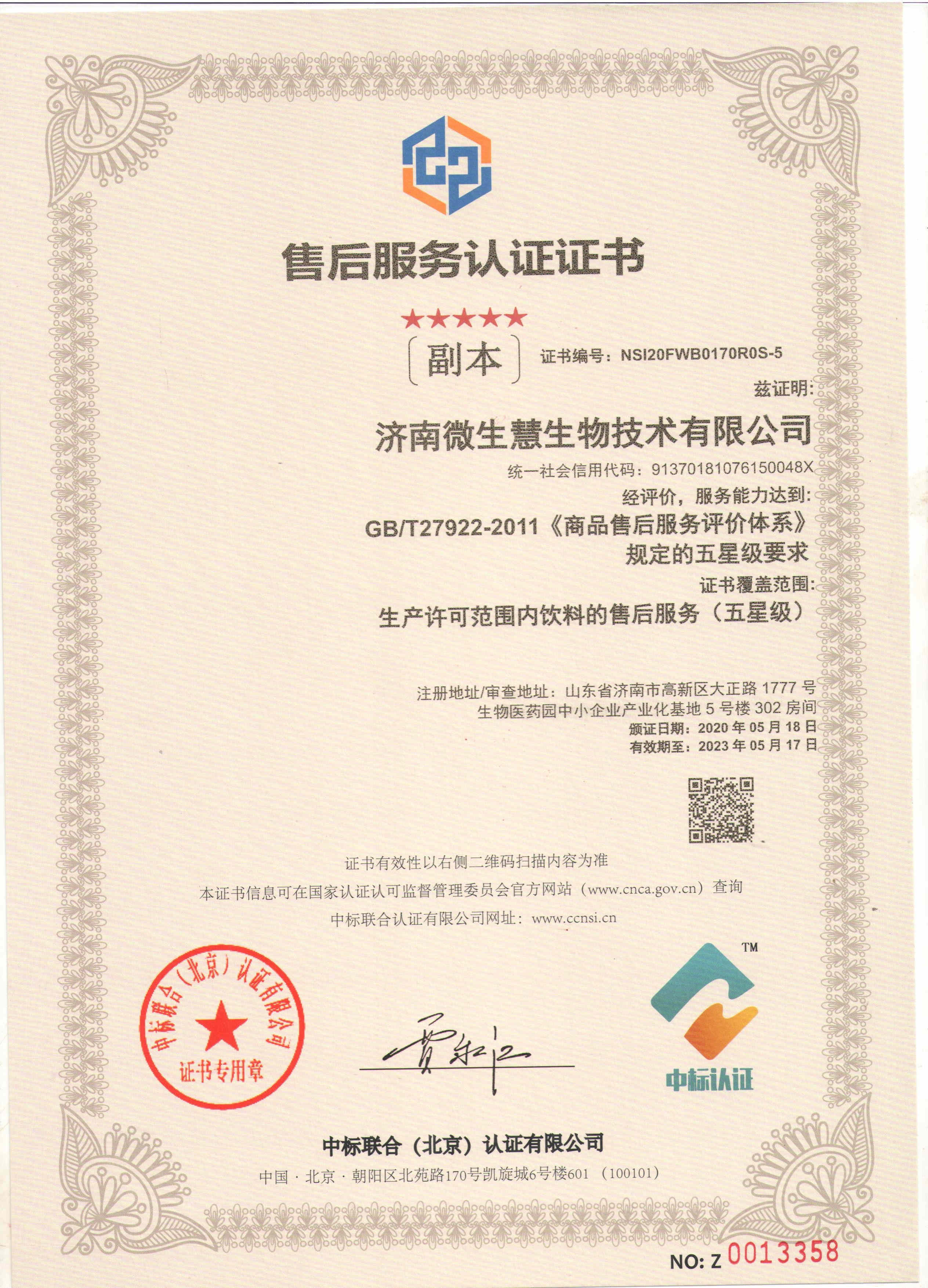 售后服務認證證書