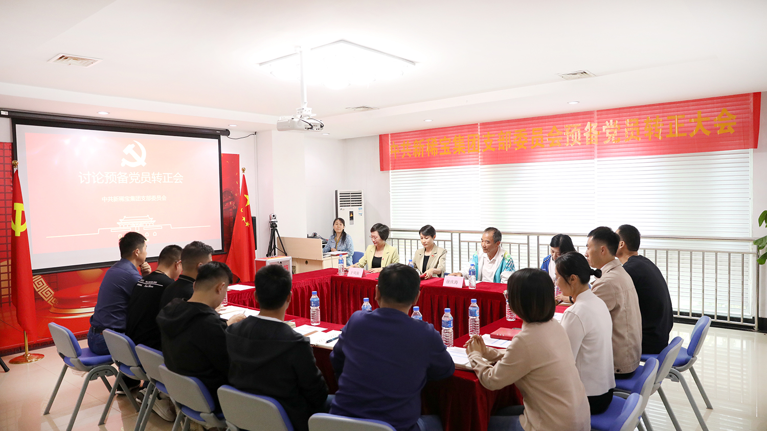 為進一步增強黨的隊伍建設(shè),及時為黨組織注入新鮮血液,增強基層黨組織的凝聚力、戰(zhàn)斗力、影響力,根據(jù)《中國共產(chǎn)黨發(fā)展黨員工作細則》等相關(guān)規(guī)定,在經(jīng)歷一年培養(yǎng)考察、征求黨內(nèi)外群眾意見、材料審查和公示轉(zhuǎn)正信息等環(huán)節(jié)后, 2023年10月9日下午,新稀寶黨支部組織召開支部黨員大會,討論預(yù)備黨員陶青松、楊延躍、李志國同志的轉(zhuǎn)正問題。大會特別邀請了濟南高新區(qū)齊魯軟件園黨委奧盛片區(qū)黨建指導(dǎo)員徐慶海書記、黨建專員張麗同志,集團總經(jīng)理、支部組織委員于鳳仙同志和全體黨員參加了會議,會議由支部書記鄭朝霞同志主持。