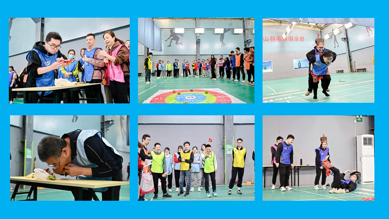 接下來是水果大戰(zhàn),大家囫圇吞棗般吞下了各自挑選的水果,只要速度不要風(fēng)度。跳繩大賽項目,第一輪是單人指壓板跳,那其中的酸爽滋味,只有運動員本人能體驗了。男女混合跳,一男一女,平時可能沒有交流過的同事,現(xiàn)在需要面對面,看著對方近在咫尺,想跳更想笑。扔沙包項目看似簡單,但想拿分還是必須有點技巧在身上,運動高手頻頻失手,平時的林妹妹屢刷新高,讓人看不到最后都猜不出結(jié)果。愛的魔力轉(zhuǎn)圈圈,一根布條,纏住了兩個人,轉(zhuǎn)起來的姿勢,有人像跳舞美觀優(yōu)雅,有人像大猩猩笨拙搞笑;轉(zhuǎn)完后有人還能跑直線,速度不遜平時,有人像醉酒一樣?xùn)|倒西歪,找不清方向。徒手競速趣味性十足,一塊小小的糖果系在紅繩上,只能靠嘴巴吃掉,糖果晃來晃去,人也跟著晃東晃西,看著滑稽搞笑,各種表情包層出不窮;另一位隊員徒手穿褲子,東北味道十足的大花褲衩,配上甩腳蹬腿扭腰提臀一系列腿部運動,偶像包袱碎了一地,周圍觀眾哈哈大笑,拍腿抹淚好不熱鬧。
