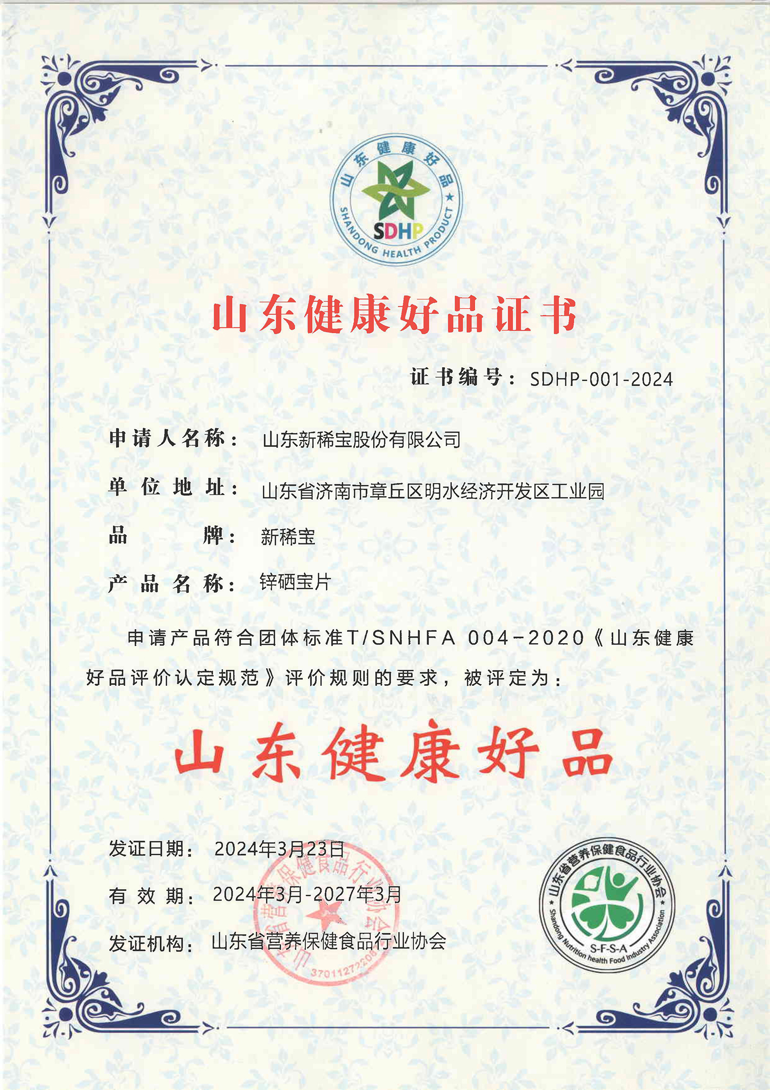 2024年3月23日,山東省營養(yǎng)健康產(chǎn)業(yè)高質(zhì)量發(fā)展論壇在青島順利舉辦,會上公布了第二批山東健康好品獲獎名單。其中,新稀寶集團(tuán)旗下產(chǎn)品“鋅硒寶片”被二次授予“山東健康好品”的稱號。