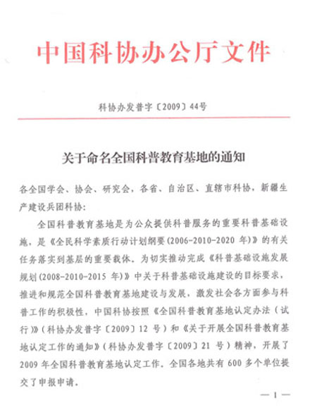 2009年9月,中國科協(xié)組織開展了為期3個(gè)月的第一、二批全國科普教育基地綜合評估工作,我單位也積極遞交了全國科普教育基地的申請。經(jīng)全國學(xué)會、省級科協(xié)等推薦單位對本轄區(qū)、本系統(tǒng)全國科普教育基地的測評,中國科協(xié)組織專家進(jìn)行了細(xì)致認(rèn)真的評審和抽查,全國僅認(rèn)定科普教育基地200多家。我單位以良好的硬件設(shè)施和突出的科普工作業(yè)績在數(shù)百家申報(bào)單位中脫穎而出,順利通過認(rèn)定,成為全國微量元素領(lǐng)域中唯一一家被國家科協(xié)命名的科普教育基地。