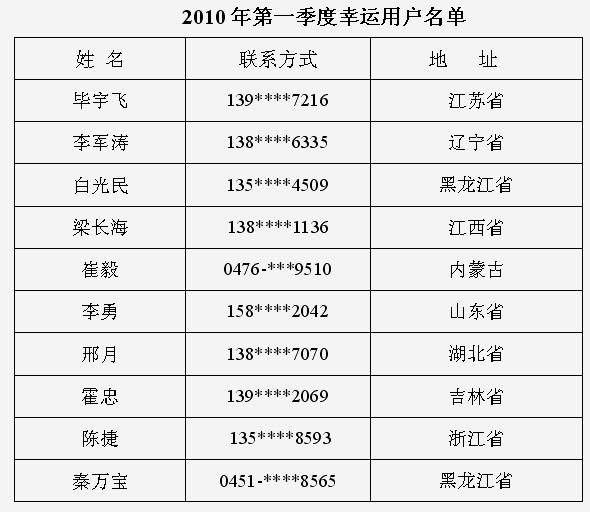 2010年第一季度新稀寶幸運(yùn)用戶(hù)名單
