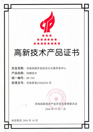 高新技術(shù)產(chǎn)品證書(shū)—鋅硒寶