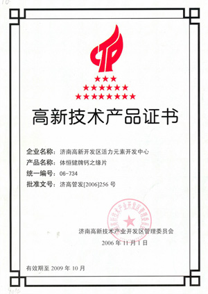 高新技術(shù)產(chǎn)品證書(shū)—鈣之緣