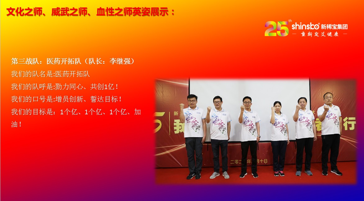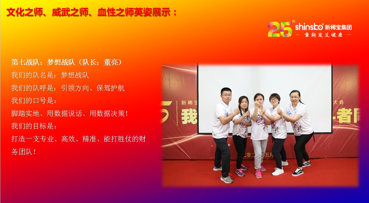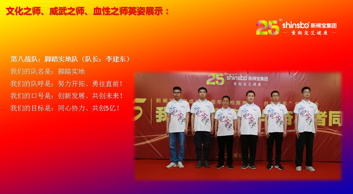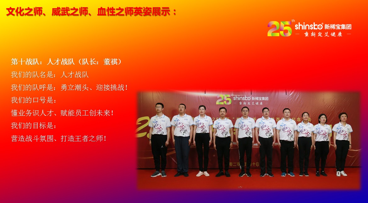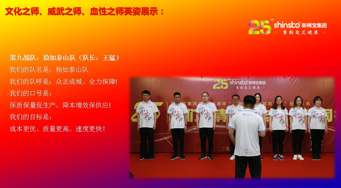 在文化儀式后緊接著舉行了隆重的“文化之師、威武之師、血性之師” 誓師大會(huì)。各戰(zhàn)隊(duì)步入會(huì)場(chǎng)就被熱烈的現(xiàn)場(chǎng)氛圍所感染,主屏展架抒寫“25我們正青春”與奮斗者同行的格言,大紅背景墻點(diǎn)綴出新稀寶集團(tuán)“相聚攜手 共筑百年”25周年紀(jì)念大會(huì)”活動(dòng)主題,兩條大氣宏偉、耀眼奪目橫幅 “增強(qiáng)緊迫感、聚焦主戰(zhàn)場(chǎng)、打好翻身仗;抓住新機(jī)遇、創(chuàng)造新優(yōu)勢(shì)、再創(chuàng)新輝煌”為誓師大會(huì)營(yíng)造了良好戰(zhàn)斗氛圍,使各戰(zhàn)隊(duì)、各戰(zhàn)將從視覺上、思想上、感知上,感受到公司的凝聚力、向心力、變革力、戰(zhàn)斗力。