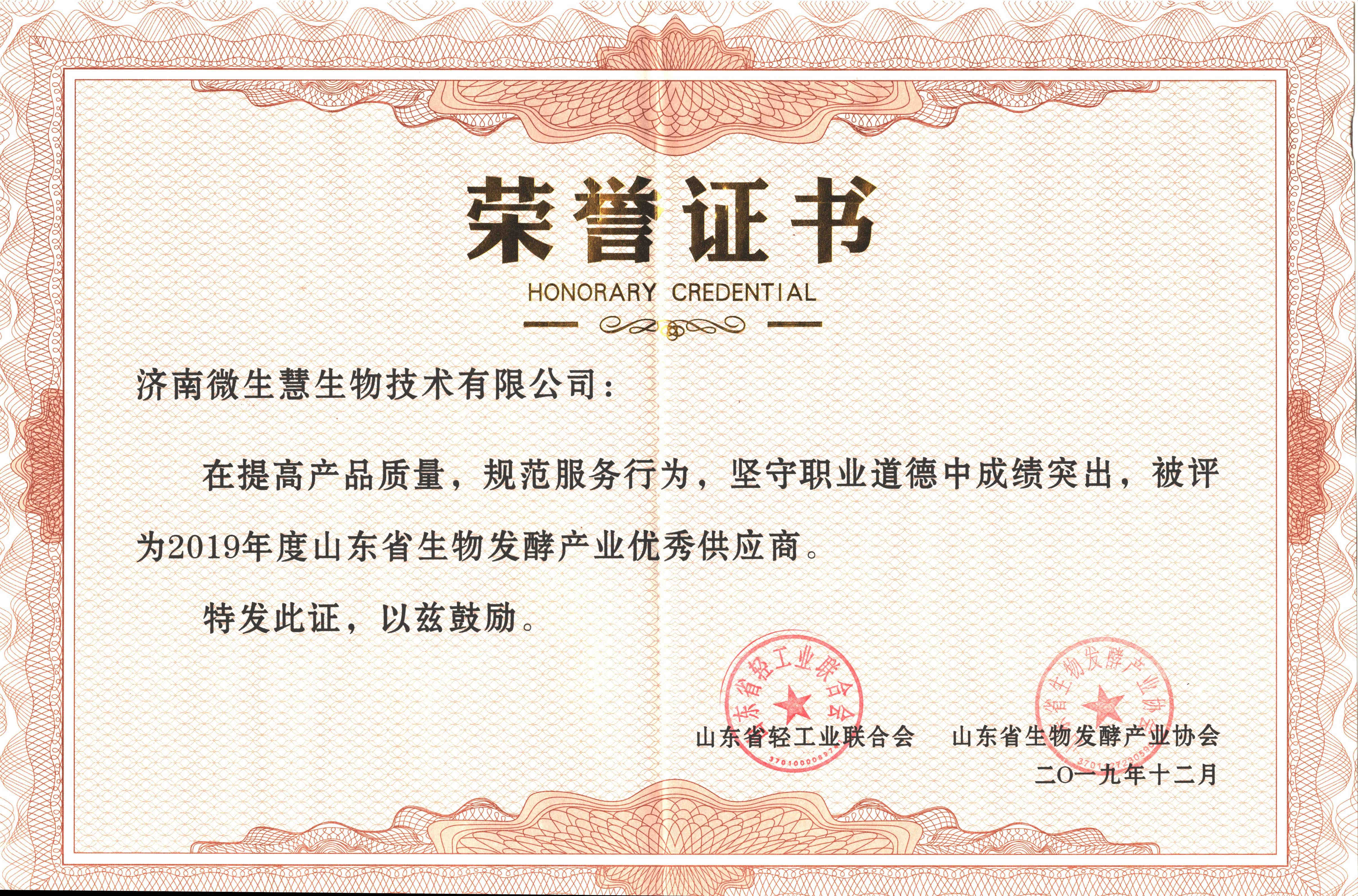 2019年12月被山東省輕工業(yè)聯(lián)合會、山東省生物發(fā)酵產(chǎn)業(yè)協(xié)會評為