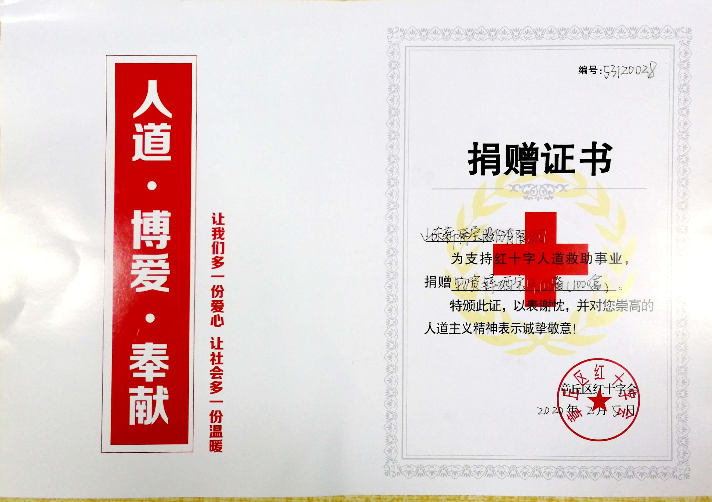 月章丘區(qū)紅十字會頒發(fā)